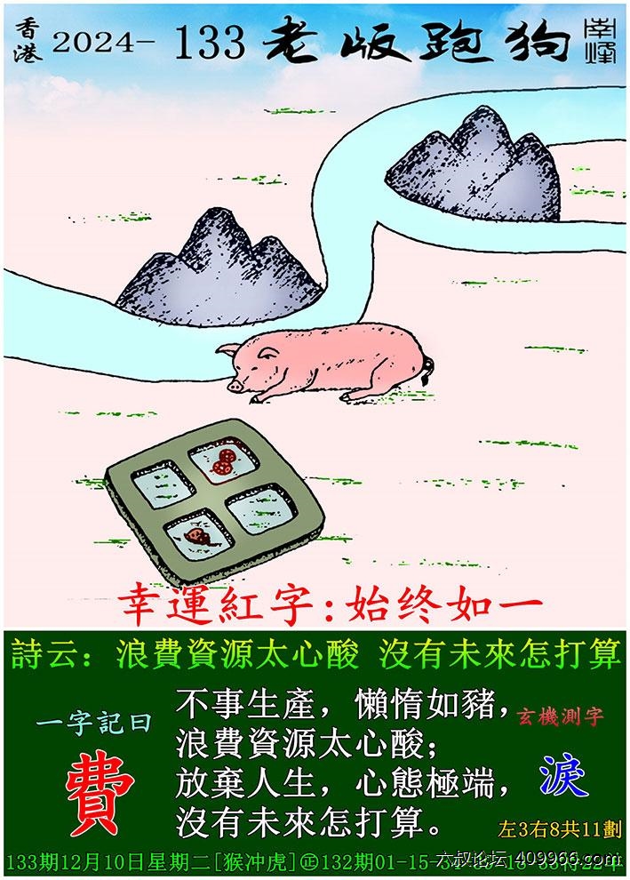 133期老版跑狗一字記之曰:【費】 詩雲:浪費資源太心酸,沒有未來怎打算。
