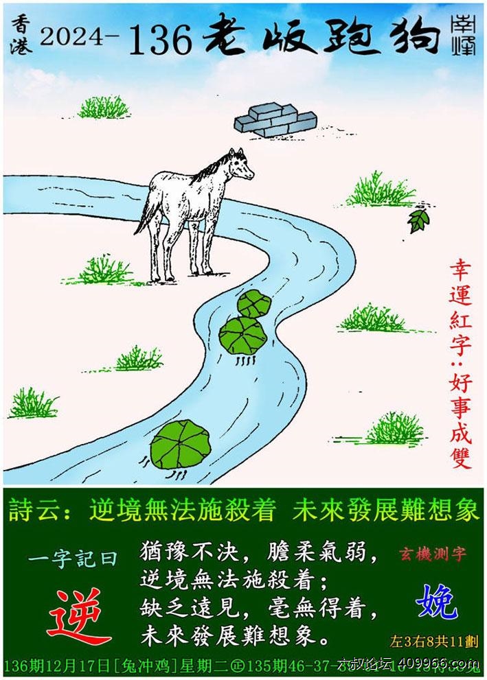 136期老版跑狗一字記之曰:【逆】 詩雲:逆境無法施殺着,未來發展難想像。