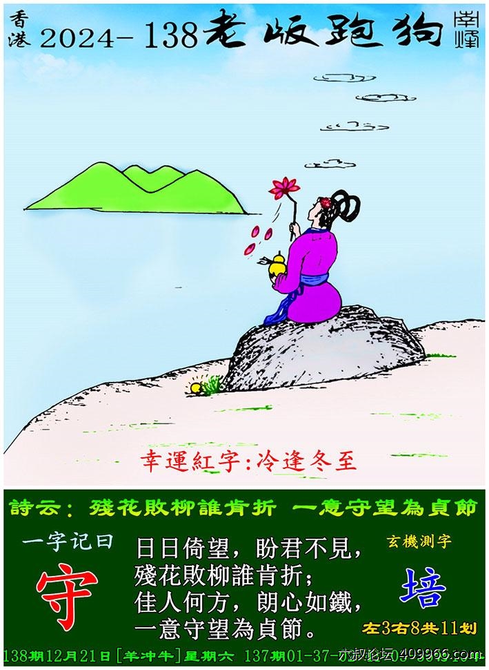 138期老版跑狗一字記之曰:【守】 詩雲:殘花敗柳誰肯折,一意守望為貞節。