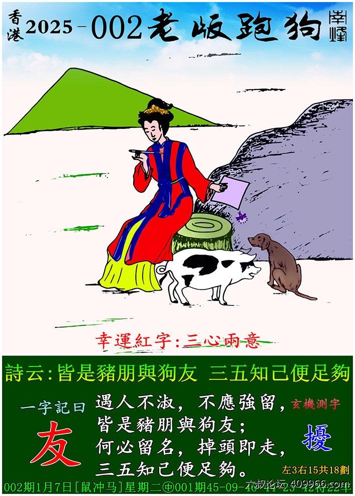 002期老版跑狗一字記之曰:【友】 詩雲:皆是豬朋與狗友,三五知己便足夠。