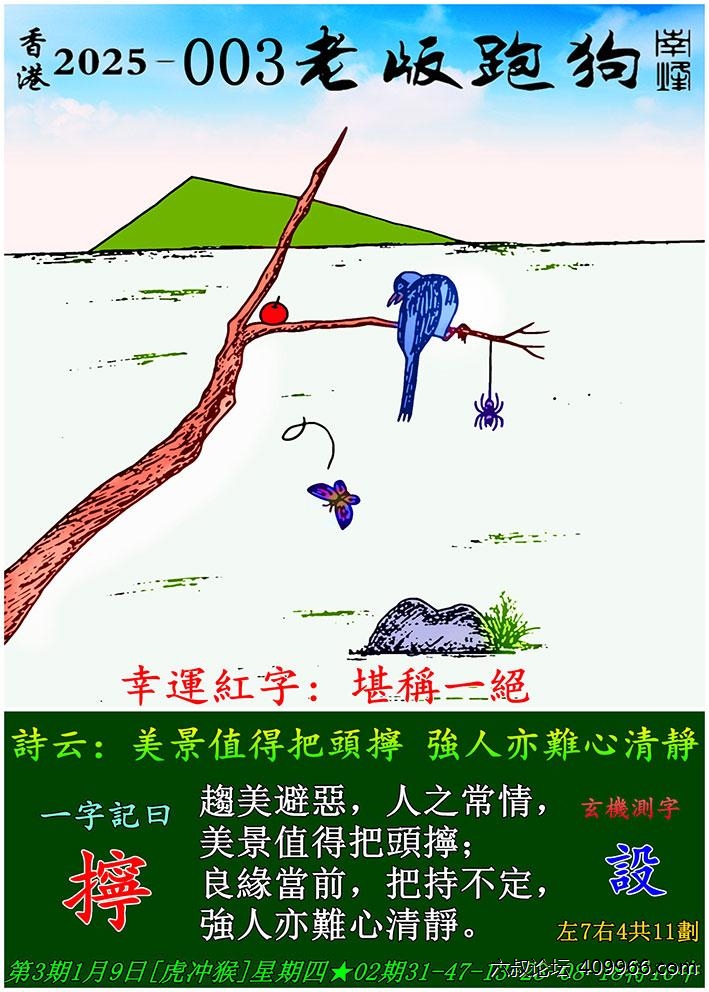 003期老版跑狗一字記之曰:【擰】 詩雲:美景值得把頭擰,強人亦難心清靜。