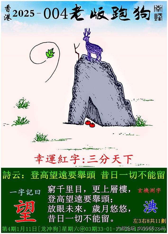 004期老版跑狗一字記之曰:【望】 詩雲:登高望遠要舉頭,昔日一切不能留。