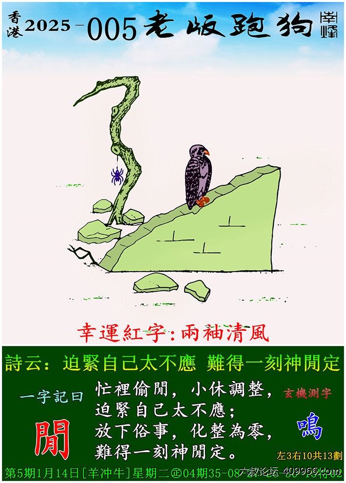 005期老版跑狗一字記之曰:【閒】 詩雲:迫緊自己太不應,難得一刻神閒定。