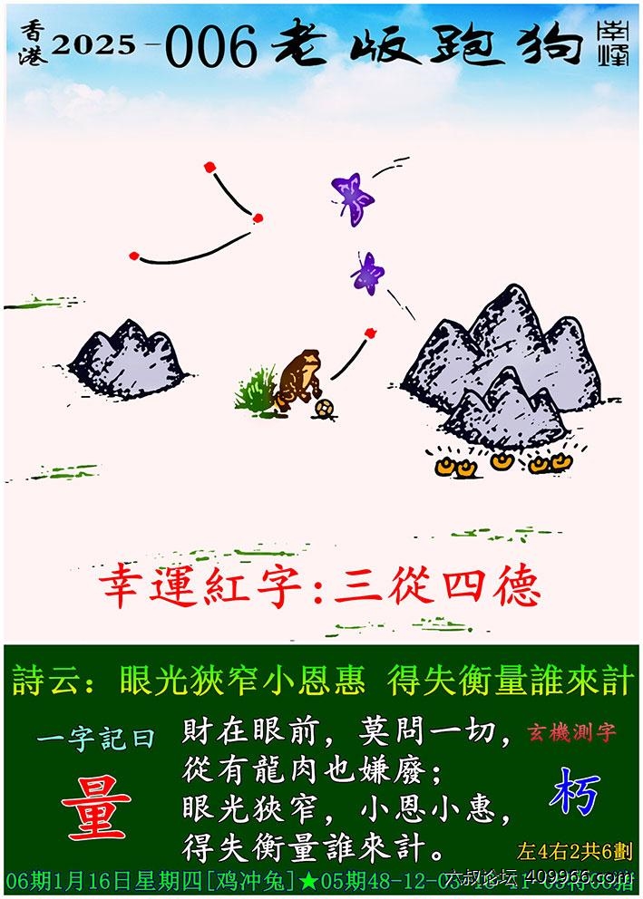 006期老版跑狗一字記之曰:【量】 詩雲:眼光狹窄小恩惠,得失衡量誰來計。