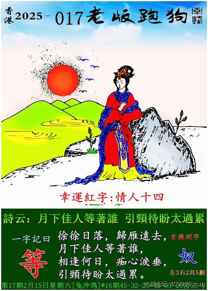 017期老版跑狗一字記之曰:【等】 詩雲:月下佳人等著誰,引頸待盼太過累。