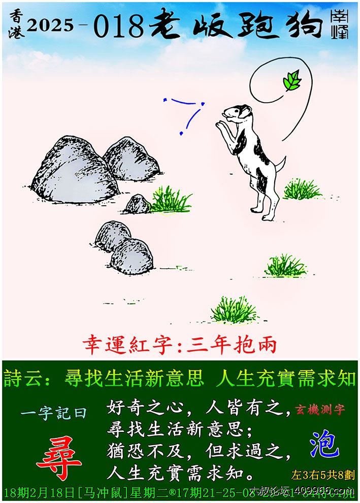 018期老版跑狗一字記之曰:【尋】 詩雲:尋找生活新意思,人生充實需求知。