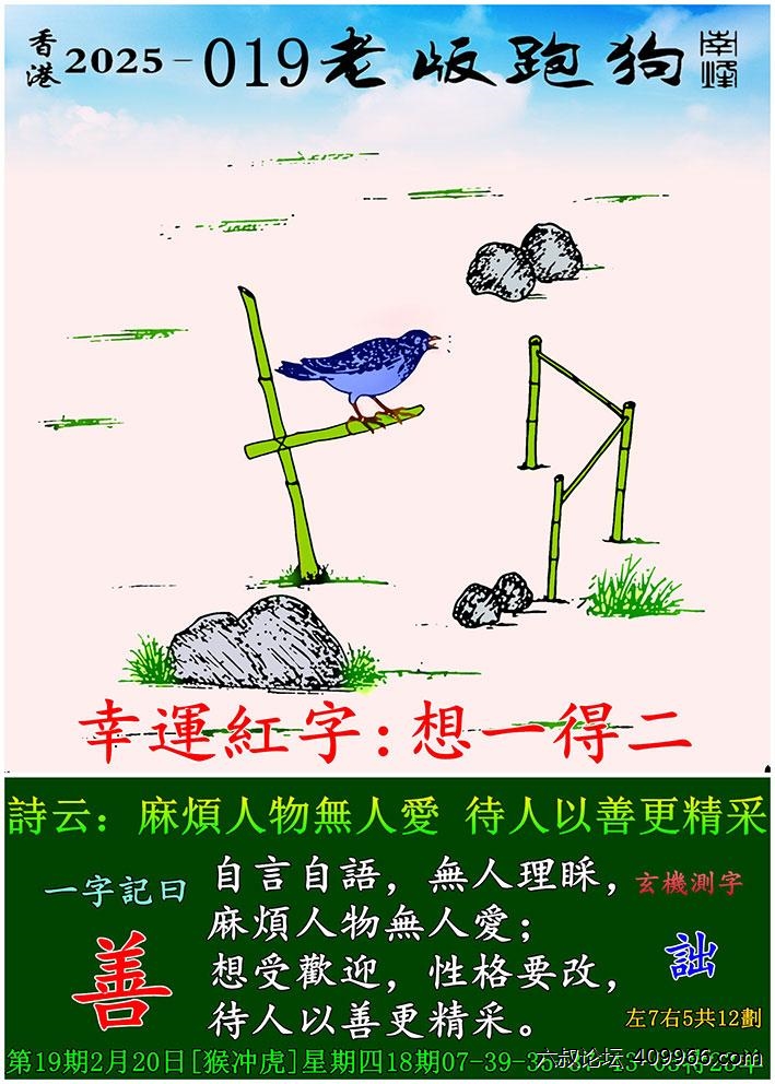 019期老版跑狗一字記之曰:【善】 詩雲:麻煩人物無人愛,待人認善更精采。