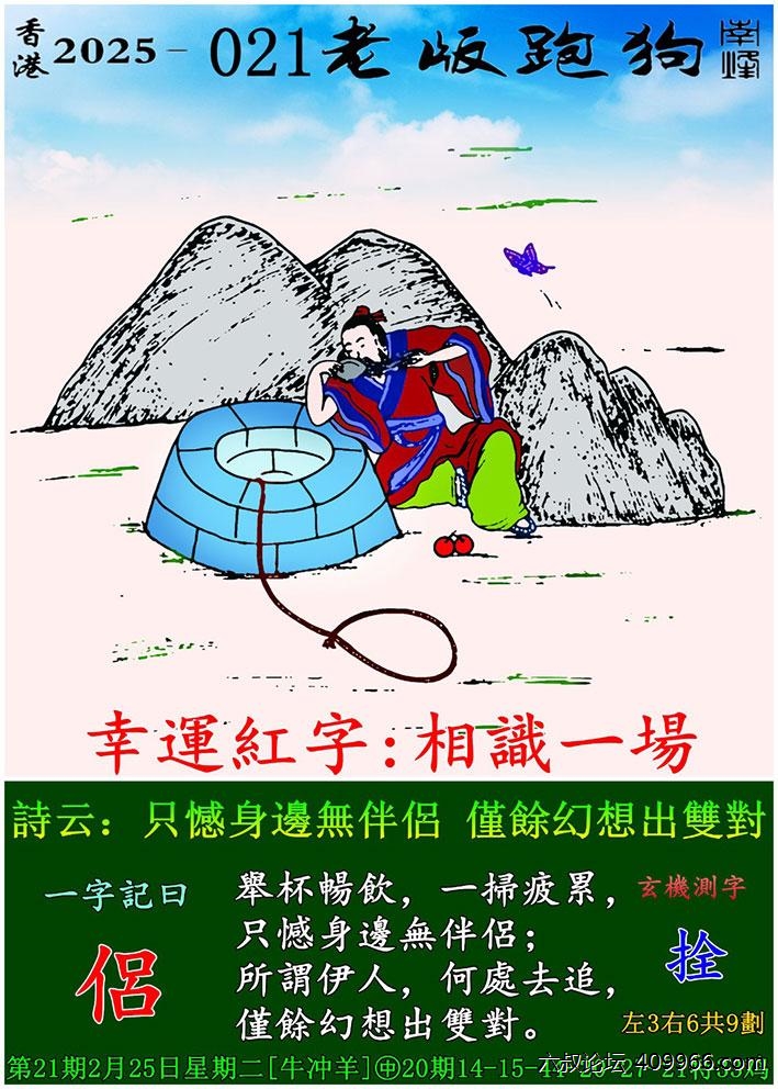 021期老版跑狗一字記之曰:【侶】 詩雲:只憾身邊無伴侶,僅餘幻想出雙對。