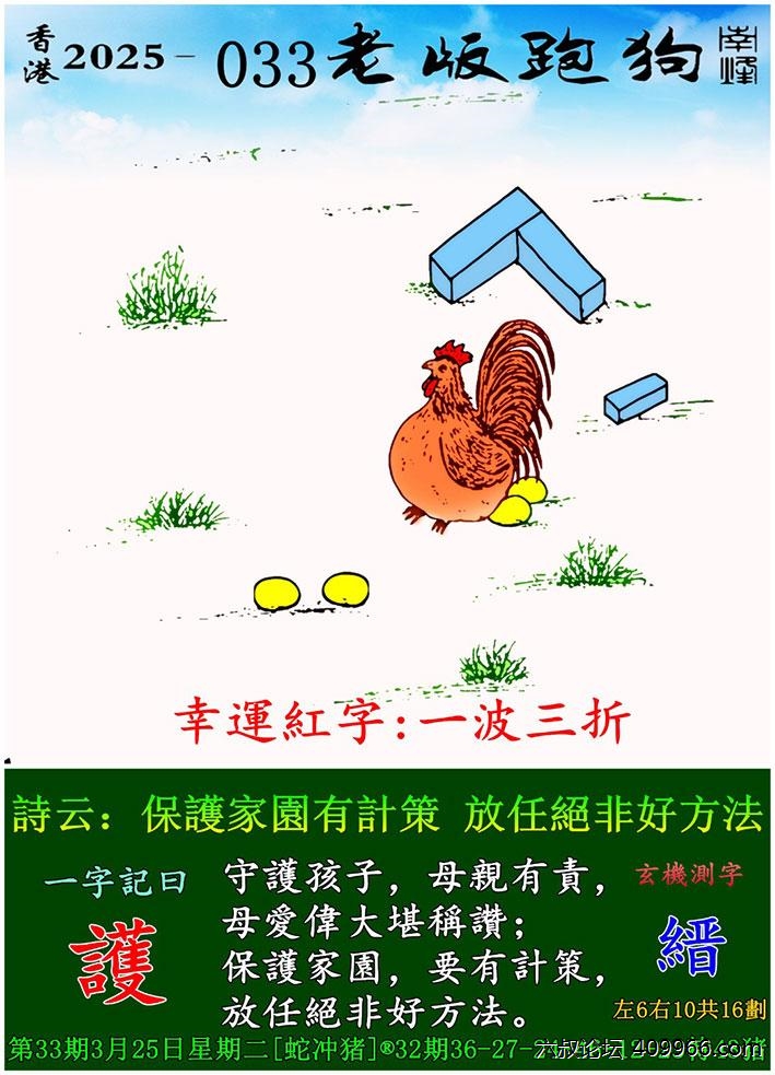033期老版跑狗一字記之曰:【護】 詩雲:保護家園有計策,放任絕非好方法。