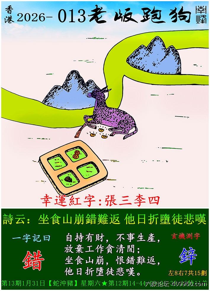 013期老版跑狗一字記之曰:【錯】 詩雲:坐食山崩錯難返,他日折墮徒悲嘆。