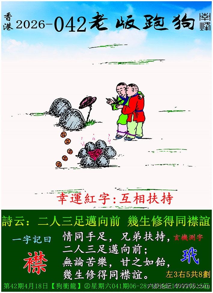 042期老版跑狗一字記之曰:【襟】 詩雲:二人三足邁向前,幾生修得同襟誼。