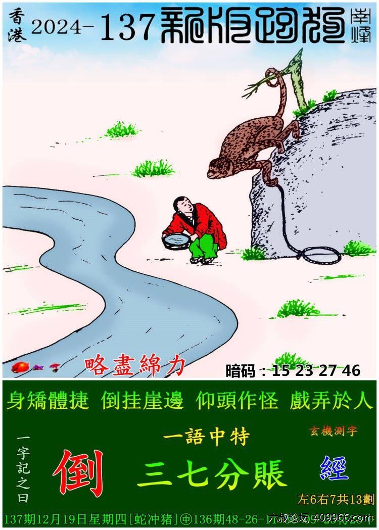 137期新版跑狗一字記之曰:【倒】 玄機測字:《經》 一語中特:三七分賬