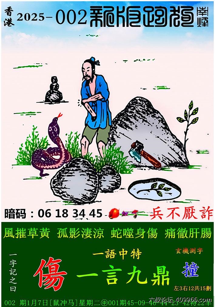 002期新版跑狗一字記之曰:【傷】 玄機測字:《撞》 一語中特:一言九鼎