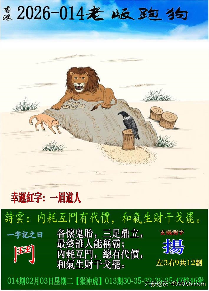 014期老版跑狗一字記之曰:【鬥】 詩雲:内耗互鬥有代價,和氣生財干戈罷。