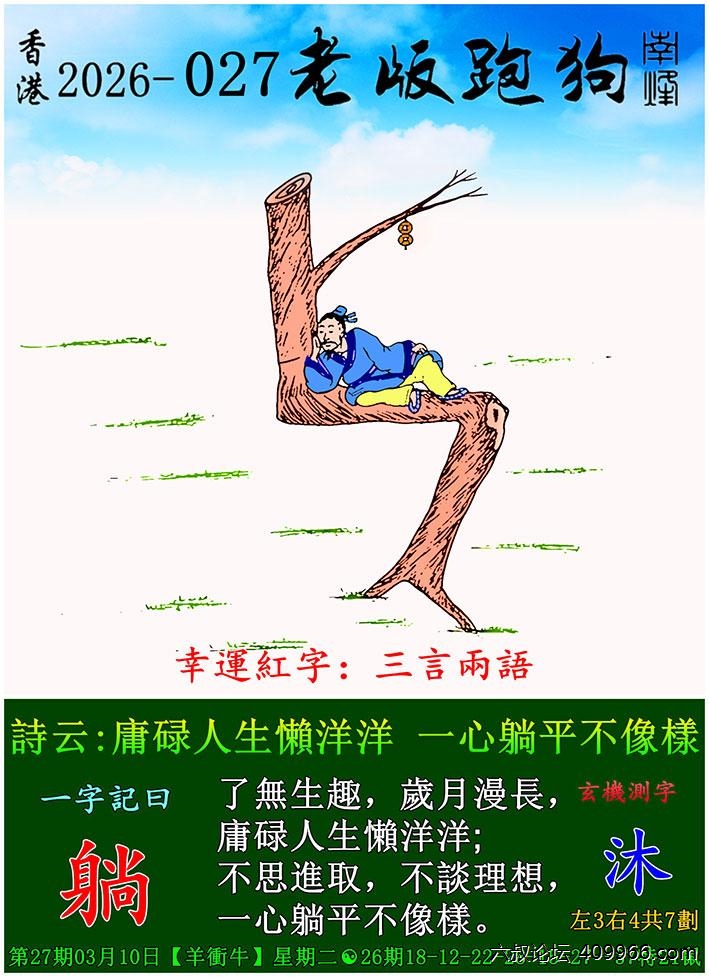 027期老版跑狗一字記之曰:【躺】 詩雲:庸碌人生懒洋洋 一心躺平不像样。